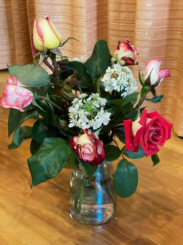 まー我が家はそんなもんだと思っていたら、ビックリした‼️おばあちゃんとドライブに行った先の道の駅で花束買ってきてくれた😆おしゃれなラッピングもなく庭から摘んできました感満載の花束デスが嬉しいものですね☺️