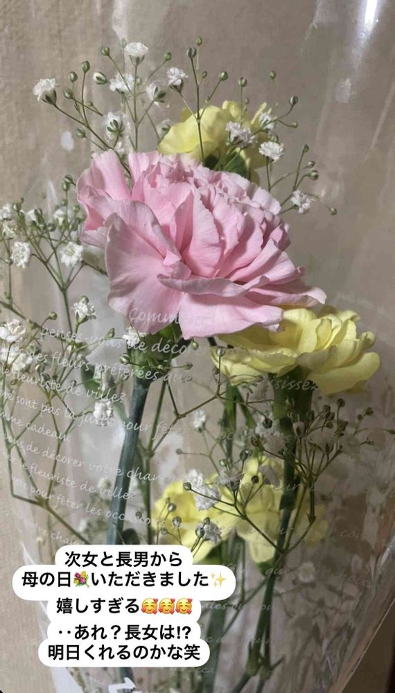 母の日。長女の高校総体があり19時過ぎに帰宅。帰ってきてすぐ「これ!母の日のプレゼント!」と次女(中2)長男(小4)から可愛らしいカーネーションを頂きました(´。✪ω✪。 ` )