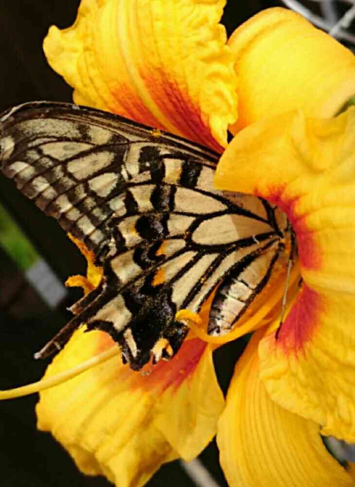 玄関で咲くデイリリーにアゲハさんが花粉だらけ(笑)になって頭を突っ込んで必死に蜜をご馳走になってます🎵美味しいのね❤逃げないんですよ❤