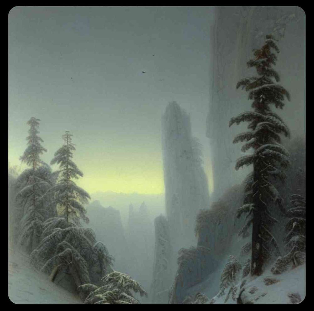 10K,高品質,写実的,油絵, 風景画 , リアル, 絶景, 幻想的,高千穂峡,雪景色,夕霧, イワン・クラムスコイ