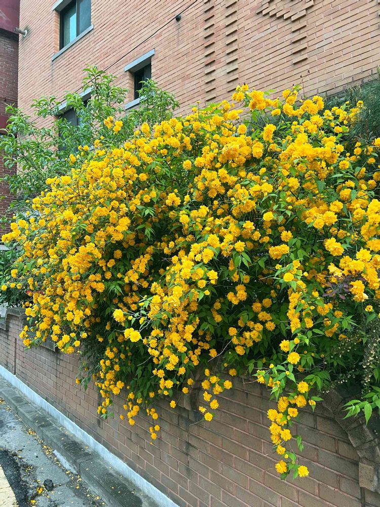 今日のお花🌼近所の住宅街で見かけたモリンモリンの🤣ヤマブキです。レンギョウと共に韓国の春を象徴するお花の一つです。