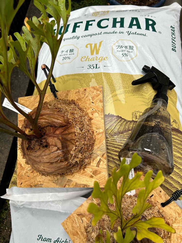 ビカクシダのリドレイにBUFFCHARで作った、バフ水をあげてみます。枯葉や雨などから栄養を補給しているビカクシダなんで、あってるんじゃないかなと思って試してみます。肥料という見方ではなく、植物が育っていた自然に近づけられたらなと思ってます。