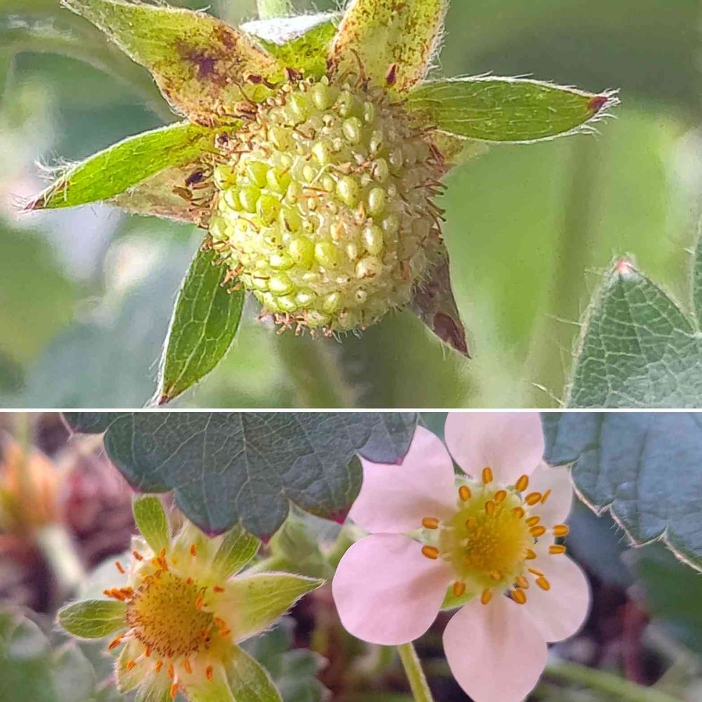 ⬆️5/15 少し膨らみ始めました。まだ青くて、小さい🍓。