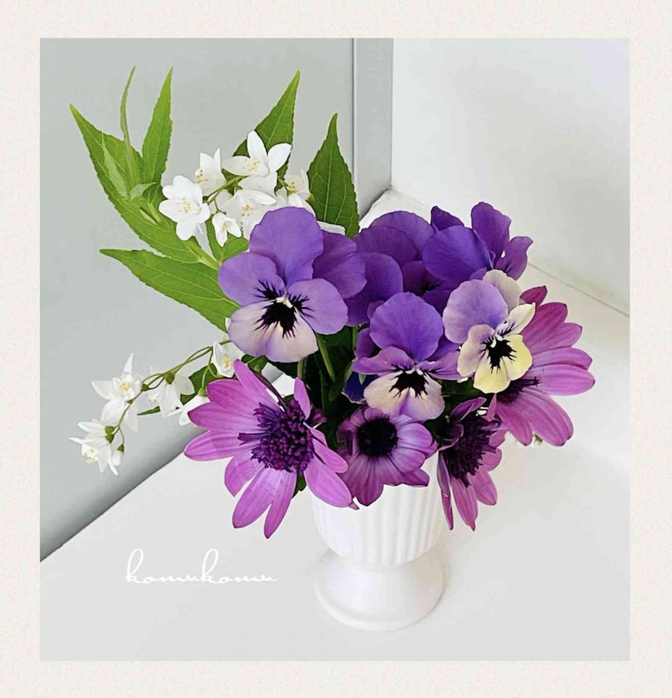 オステオスペルマムのシックなピンクから、パンジーの紫色のグラデーションがとても素敵ですね💕