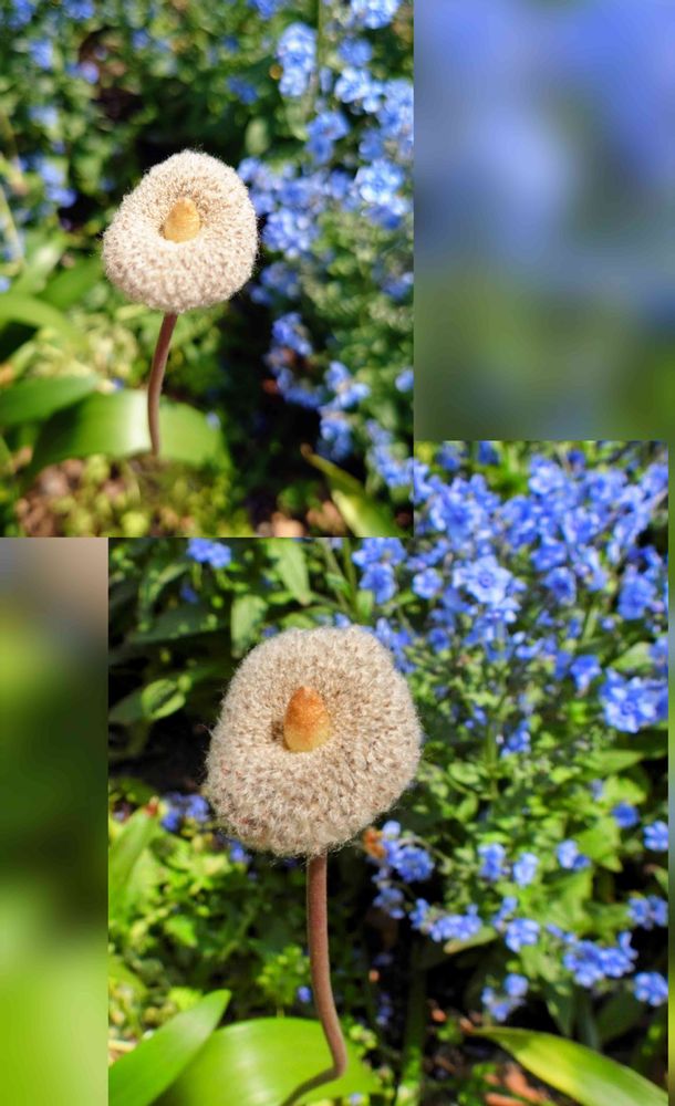 一面ブルーのシノグロッサムのお花畑の中に、こんな可愛い子を見付けました、茸と思うのですがお名前は何でしょう🤎💙🌿