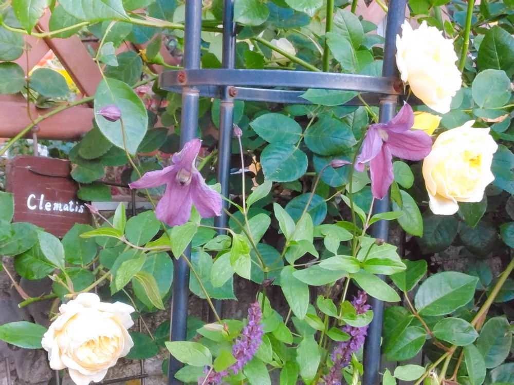クレマチスがオベリスクに絡まって咲いているところへ、薔薇が枝を伸ばしてきて、イエローの花を咲かせると見られる風景です(≧∇≦)b💕