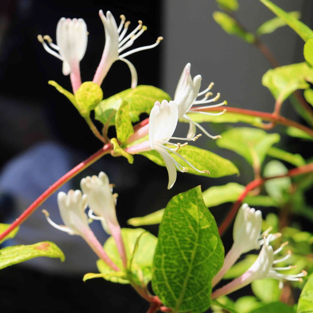 📷玄関ポーチ(5月16日)葉脈が美しいハニーサックル🌿(スイカズラ)が開花しました(//∇//)🍊