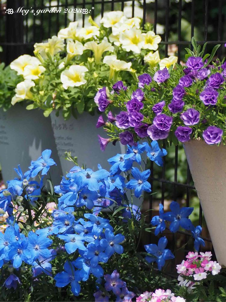 ハンギングの子たちとまだまだ元気なデルフィニウム チアブルー💙💛💜✨