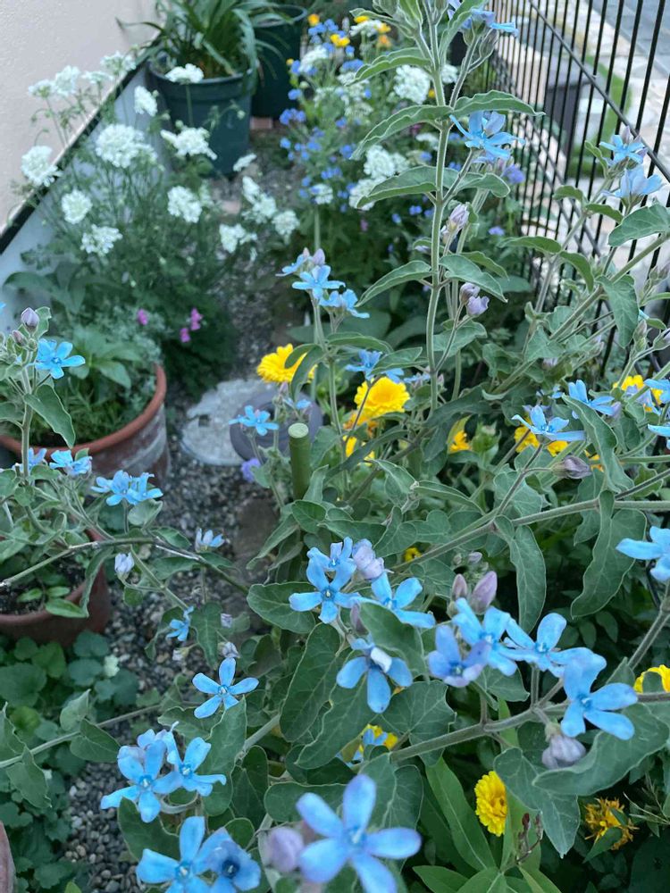 植えっぱなしのブルースターとこぼれ種の花壇です。シレネやギリアは消えてしまいそうなくらい少ないです。