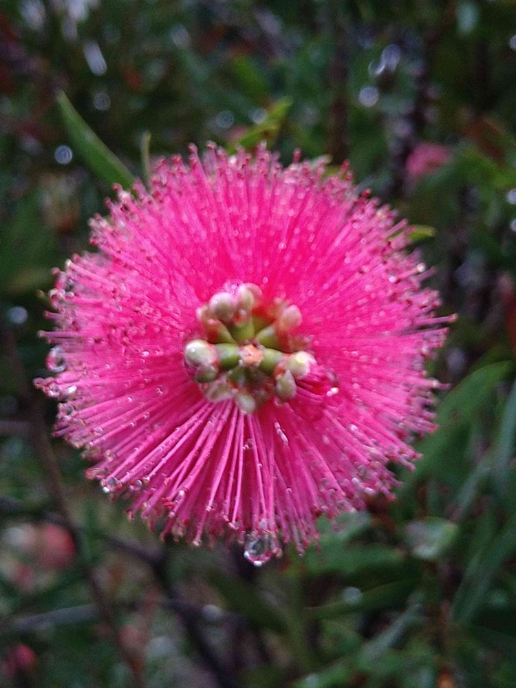雨の中、通勤途中、たくさんの人が足早に通っていく中という状況の中でも、ブラシの木の花に魅せられ、惹きつけられ、恥ずかしさも振り払い、頑張って、写真を撮りました😬
