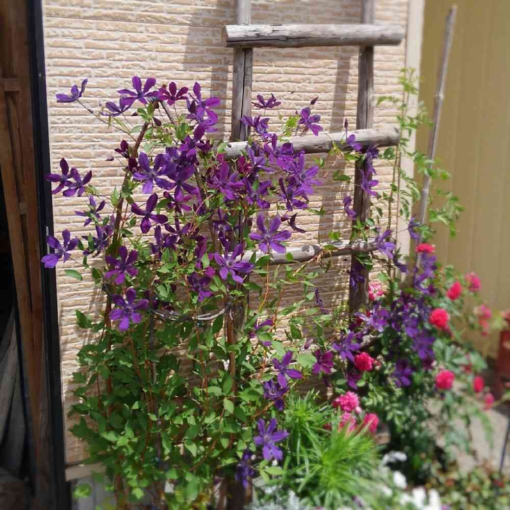 昔稲刈り後の稲束をかけて干すのに使っていた棒を使ってDIYしたラダーに這わせて、薔薇とのコラボを楽しんでいます🌱