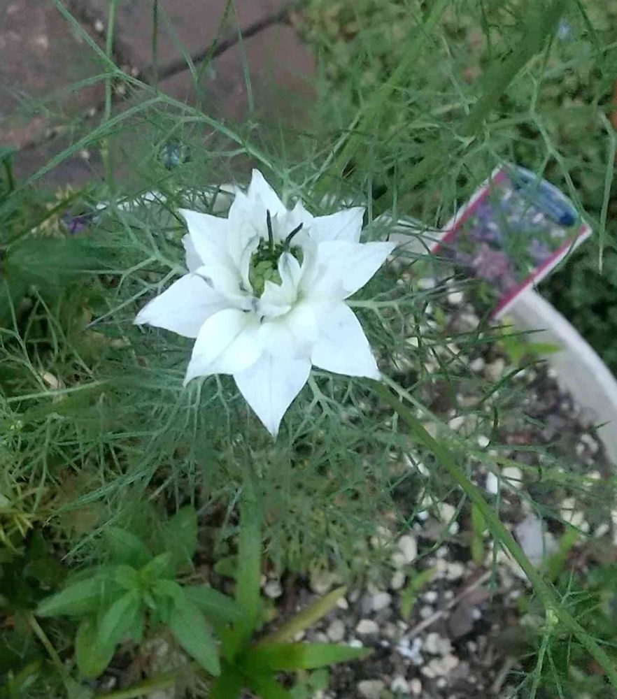 ブルーのニゲラの中に1つだけ白いニゲラが咲いてます❣️