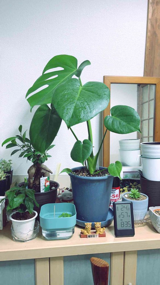 なんだかんだ新しく割れた葉っぱも生えてきて、気づけば株元も太く大きくなって来ました🍀*゜