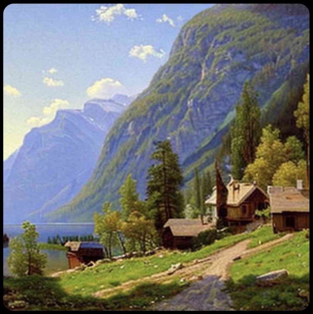 10K,高品質,写実的,油絵, 風景画 , リアル, 絶景, ヨーロッパで最も写真に撮られた場所”とも呼ばれる湖畔の街, 16世紀に建てられたアルプスの家々, ハルシュタット,オーストリア, イワン・クラムスコイ,五月晴れ