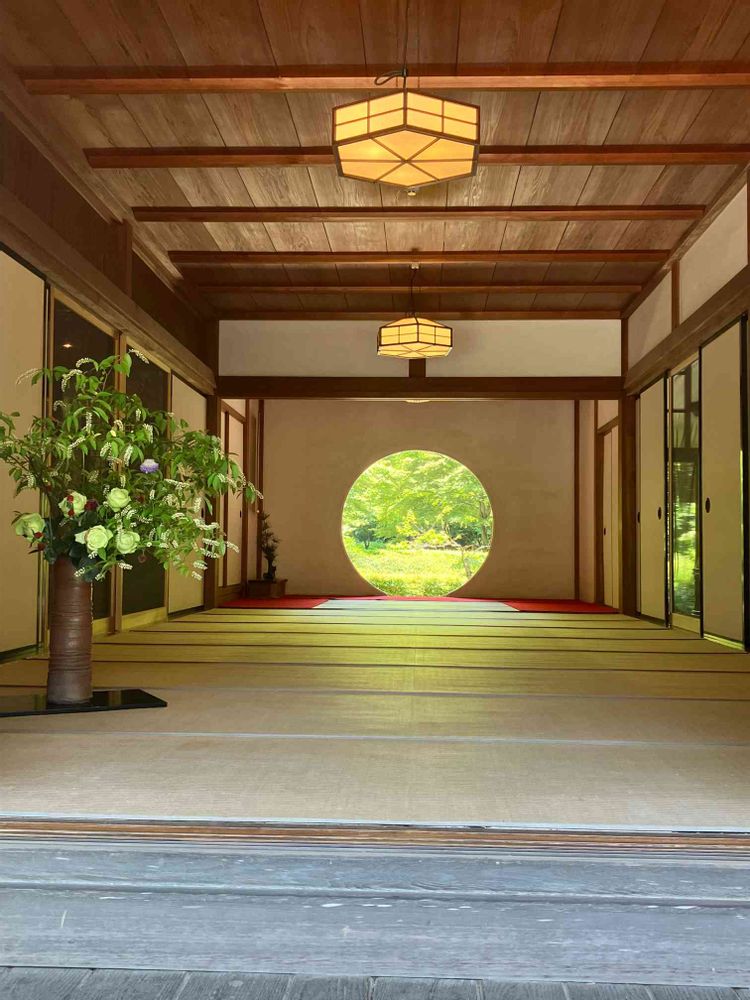 本堂の悟りの窓と呼ばれる丸窓から後庭の新緑がとても綺麗でした🍃