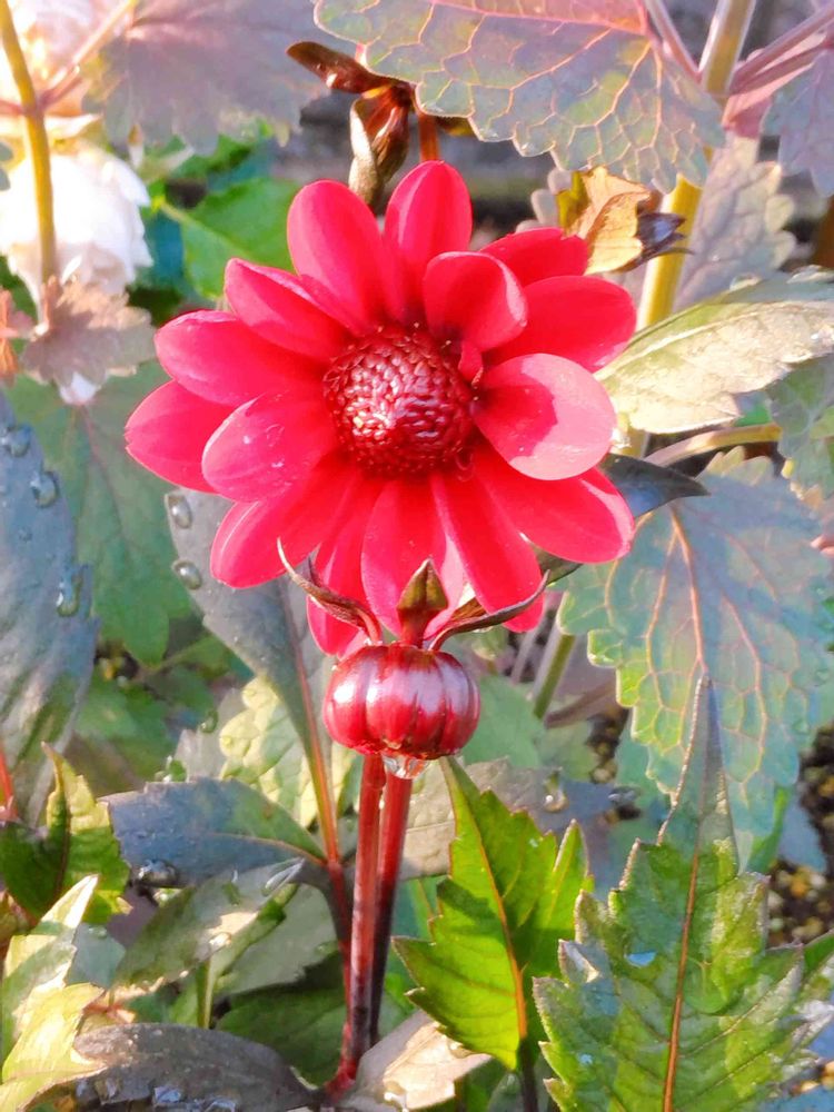宿根草の花壇に🍀銅葉プチダリア🍀の赤い花が咲き始めました😃🎶