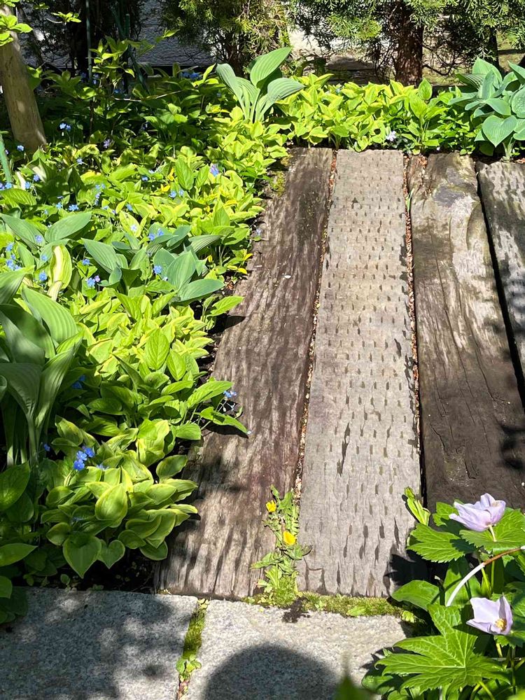 ハナルリソウがグランドカバーになって咲いた後ギボウシが伸びて来て賑やかになりました💚花芽はまだです😃