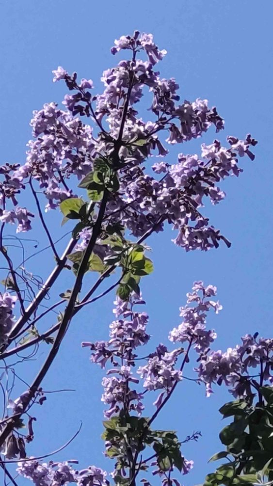 青空に溶け込みそうな紫の花、昔は沢山見れた桐ですが、放置され延び放題の木秤に成りました😢