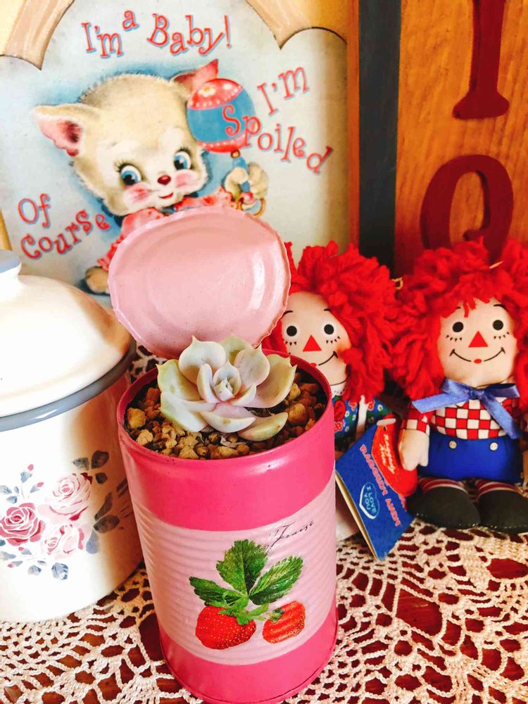ローラちゃん用のメリ缶✨ ローラちゃん、いつも窓辺に置いてたけど場所移動したら少し白からピンクに変化したの 凄い✨ 写真がメルヘンとカントリーごちやになってるね。アンとアンディ違うとこ行ってだよね。😊💦
