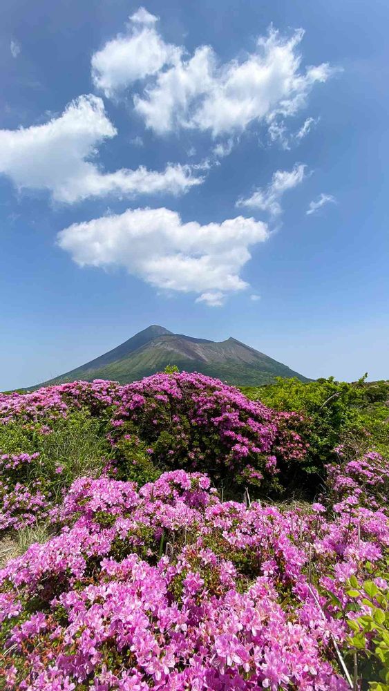🩵近い空と広がるミヤマキリシマ💖の中、天孫降臨の神話の山 高千穂峰がクッキリと❣️ 嬉しい景色です☺️
