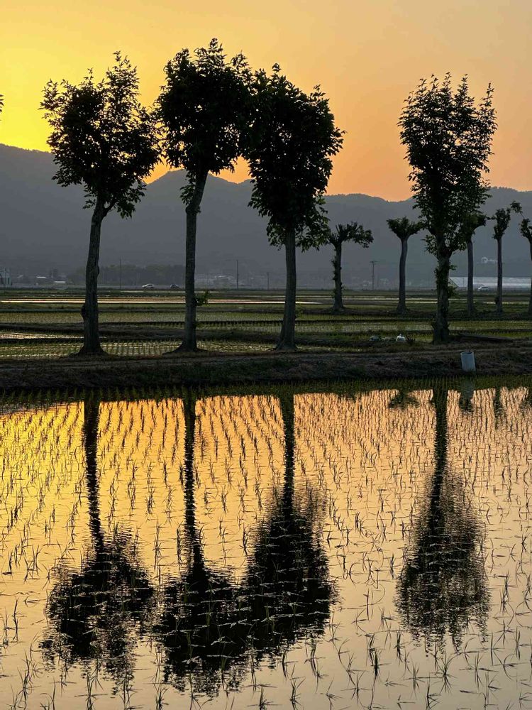 田んぼに写った夕景が、南国のようで美しいですね✨🌺🌴🍹✨