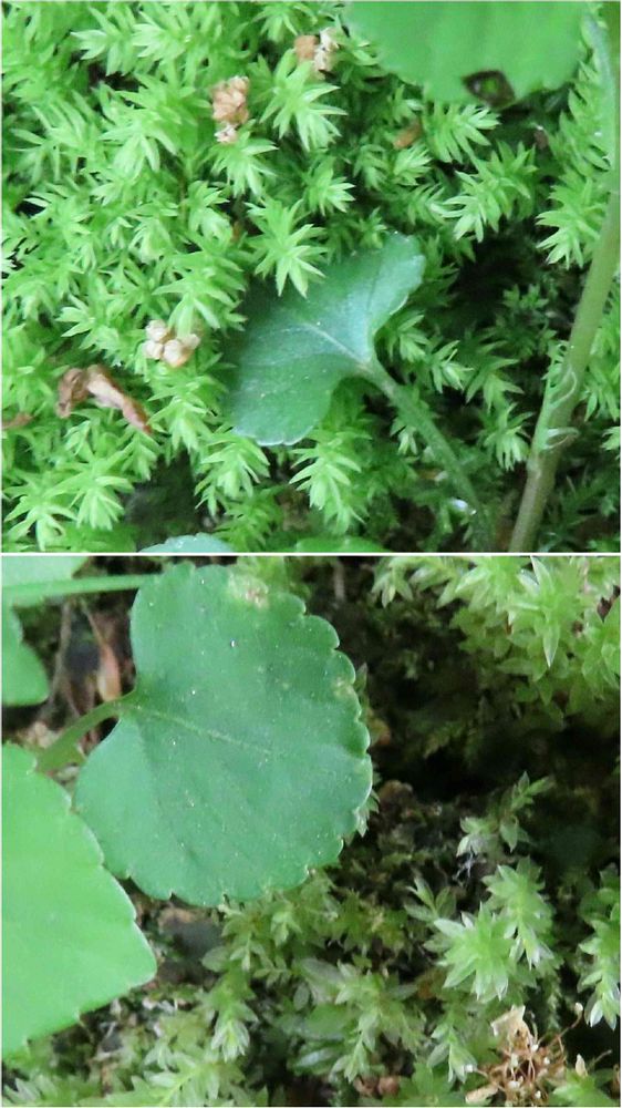 下段スミレの葉の下↓辺りには透明感のある丸みがあって大きなオオバチョウチンゴケらしき葉も写り込んでいて、それに比べると半分程の大きさで細く尖った葉の一群でした。