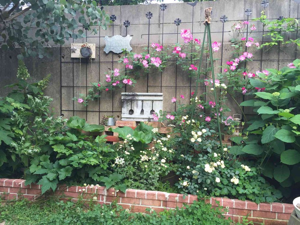 殺風景なコンクリの壁面を明るく見せたくて冬の間にレンガを積み、つるバラを誘引しました。ミニバラ、草花、雑貨を使ってお気に入りの空間になりました(*^_^*)