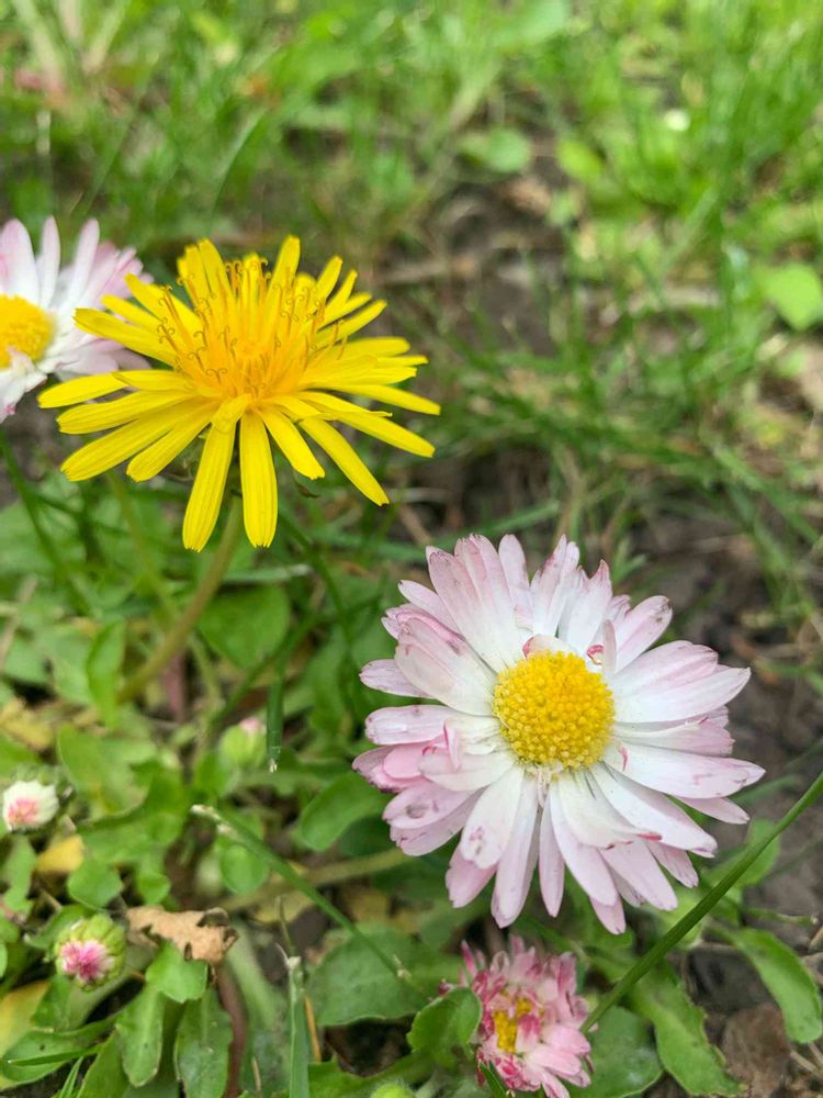 タンポポとデイジーかな?並んで咲いていて可愛らしい(๑'∇’๑)b
