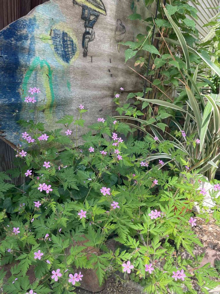 これは雑草かな?🌸かわいいので毎年放置しています。後ろにあるのは20年以上前、息子が幼稚園のお友達と一緒に作った船⁉️紀ノ川へ出航すると言うので必死に止めました😅