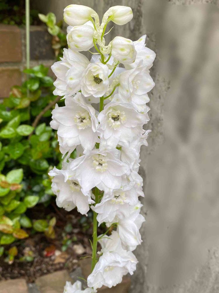 階段花壇にグリーンが欲しくお迎えしたデルフィニュウムさん。グングン成長して綺麗な白いお花を咲かせてくれました🌼
