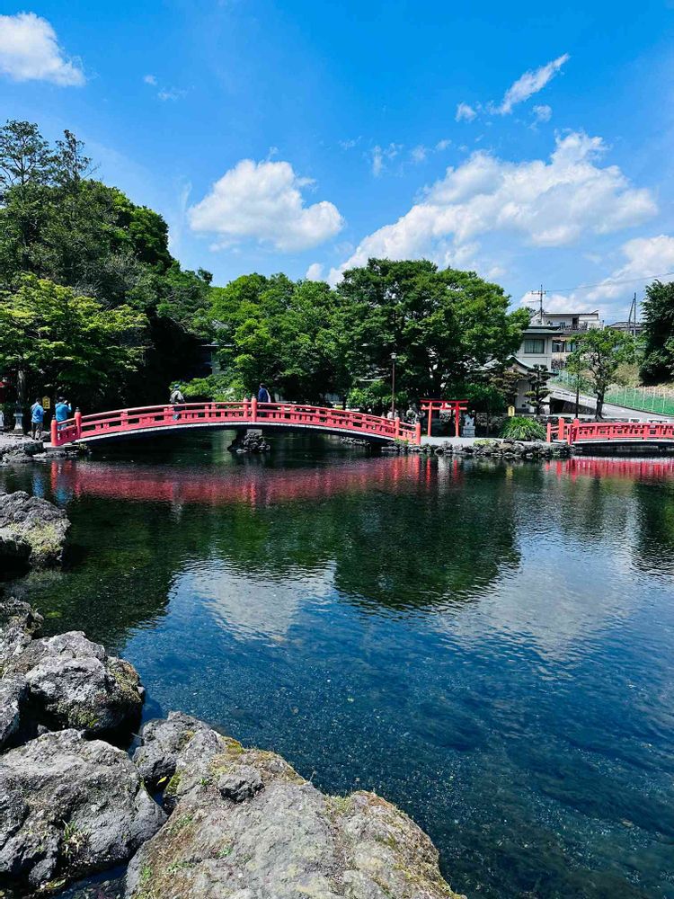 富士宮浅間大社湧玉池に映える空の蒼さと新緑。