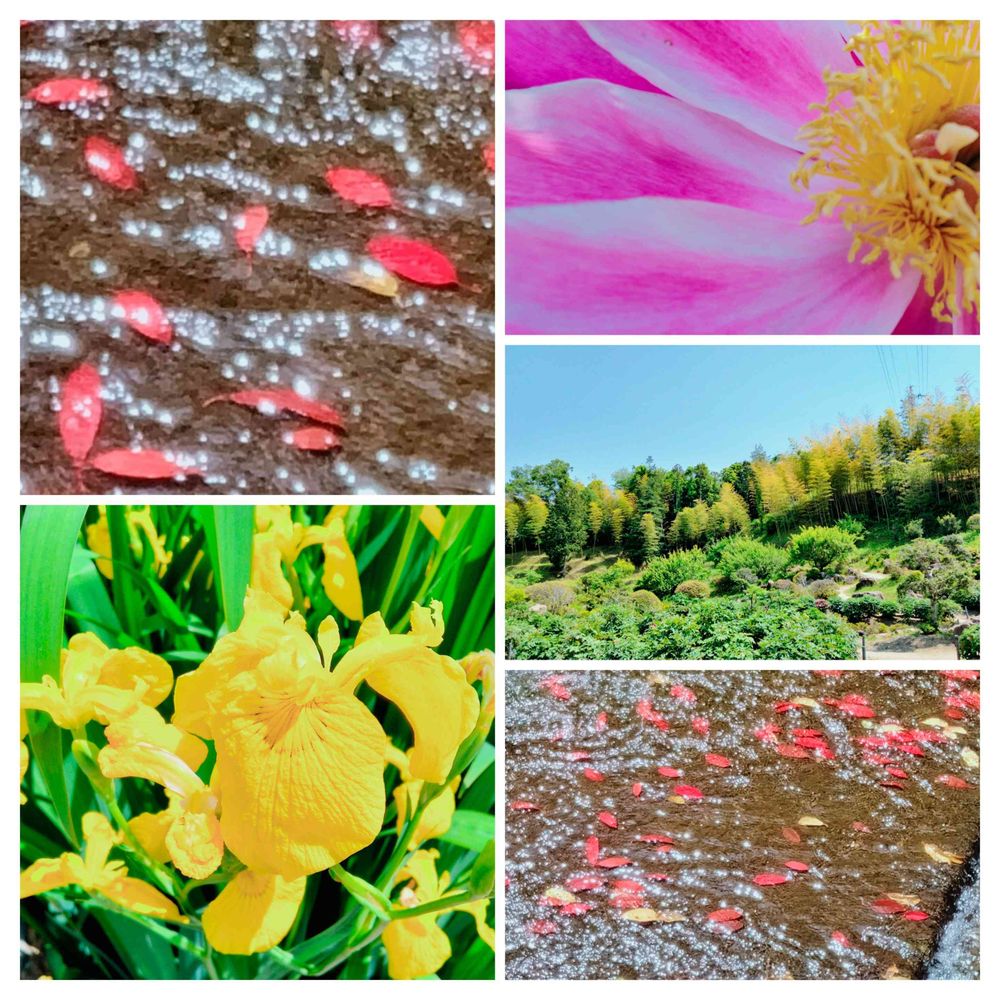 牡丹も藤も終わり。お参りした境内の小川の流れに赤い葉っぱが流てて綺麗でした😍