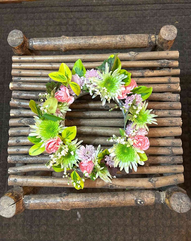 花材: スプレーマム、小菊、スプレーカーネーション、ウインタークリーパー、ヒメウツギ、 ヒューケラ、(全てお稽古後♻️です)