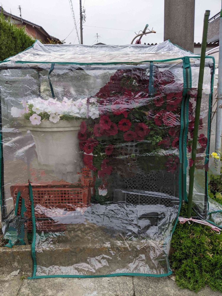今日は 1日降る予報。動かせないペチュニアを鳥かごみたいにビニールで覆ってましたが、しだれたらどーするか……考えに考えて、思い出した😁😁ファスナー部分が破れた簡易温室の存在…