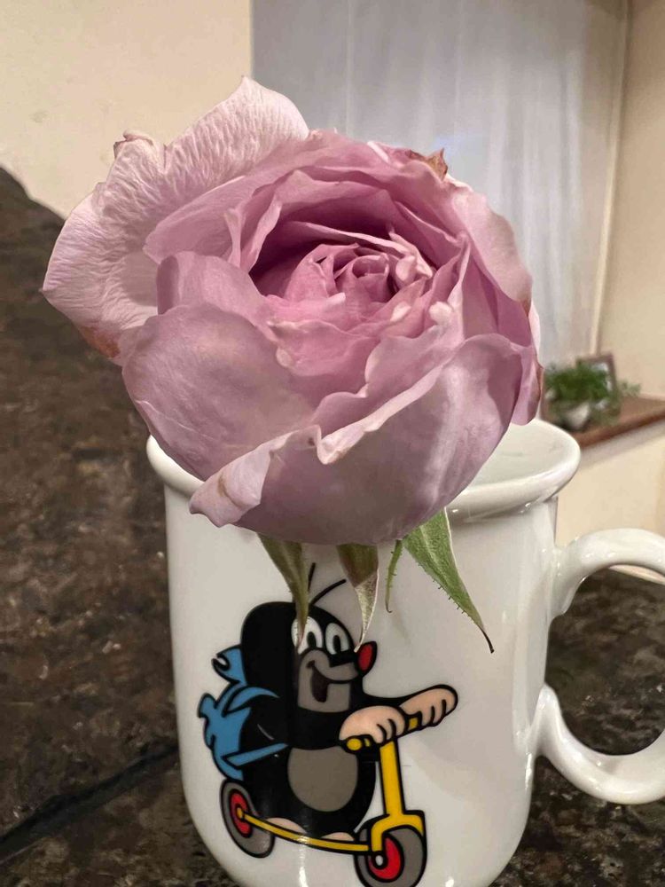 *全開は無理そうですが、ルシファーが咲いてくれました。子どもが小さい時に使っていたマグカップに