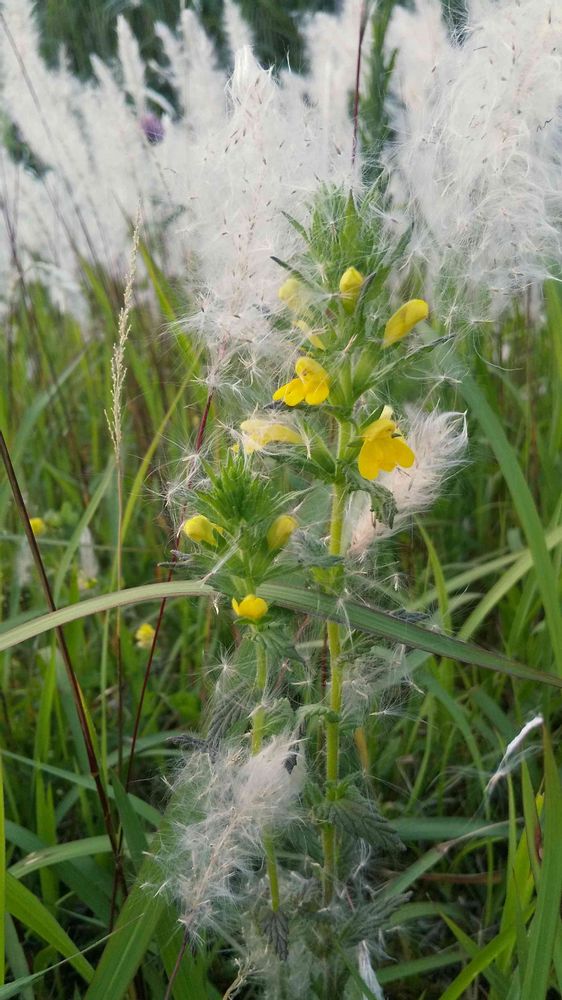 チガヤの綿毛を引っ付けたセイヨウヒキヨモギの姿は