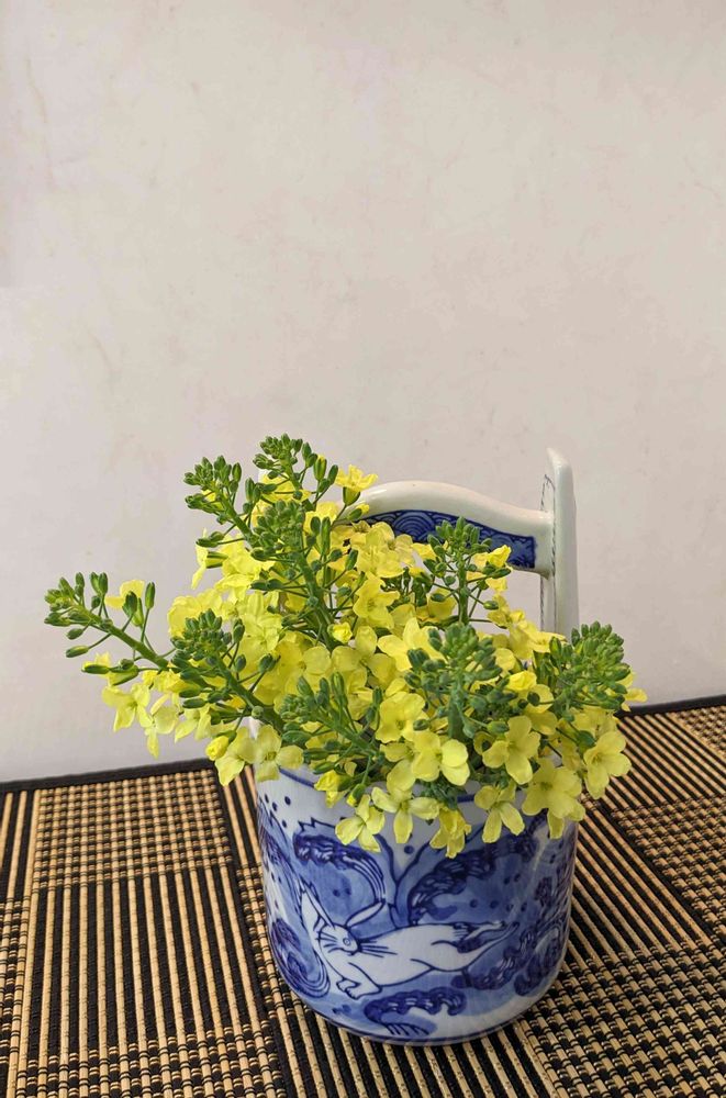 藍の手桶の取っ手が見えるように短く切って生けました💛💛💛