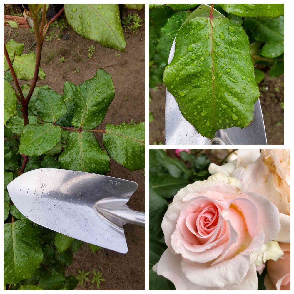 こんなにおしとやかなお花見なのに、何故かこんなにBIG😳毎年のことだけど比較のためにシャベルで比べたら5枚葉がほぼ毎日シャベル全長‼️3枚葉の大きな葉がシャベルに乗るサイズ。目盛りを読んだら12センチはある😳デカい、デカすぎる💦鉢植えのバラの葉っぱの可愛らしさはどこにもない、これぞ地植えパワー⁉️