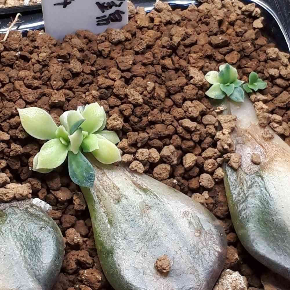 斑の入りかたが一番強い葉挿し苗🌱強烈ですね✨提灯の一歩手前です。多頭なのですが、右側は全斑です✨さらに右の小さい個体も綺麗な斑入りになってます🌱
