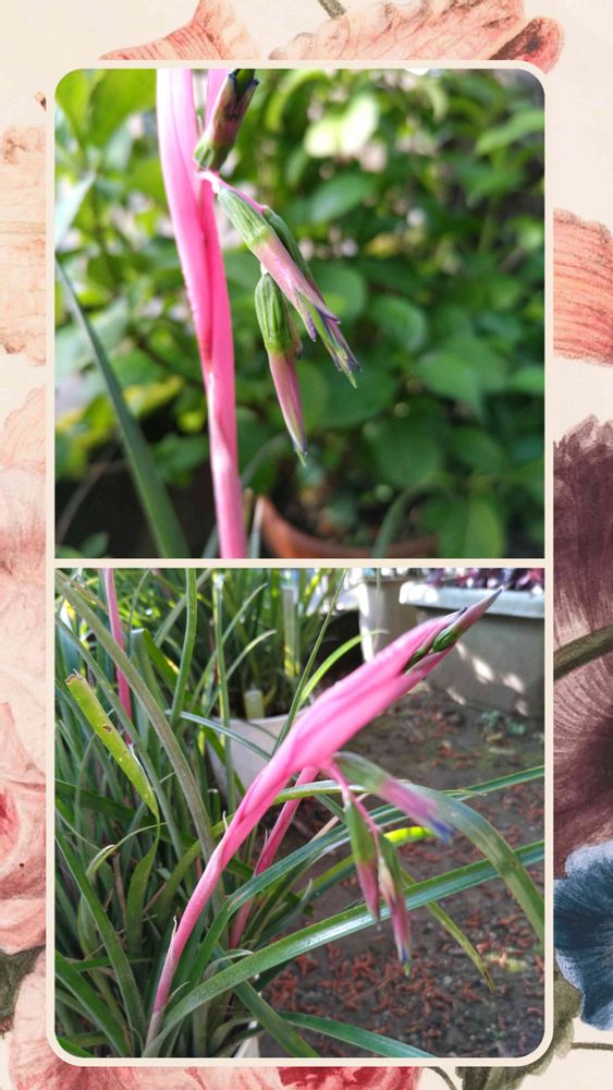 ヨウラクツツアナナス『女王の涙』の花茎からお花がのぞいてきたよ🥳去年株分けして4鉢あるけど全部お花を咲かせる準備をしています✌このあとも変身してくれます🤗楽しみだよ🎊🤩