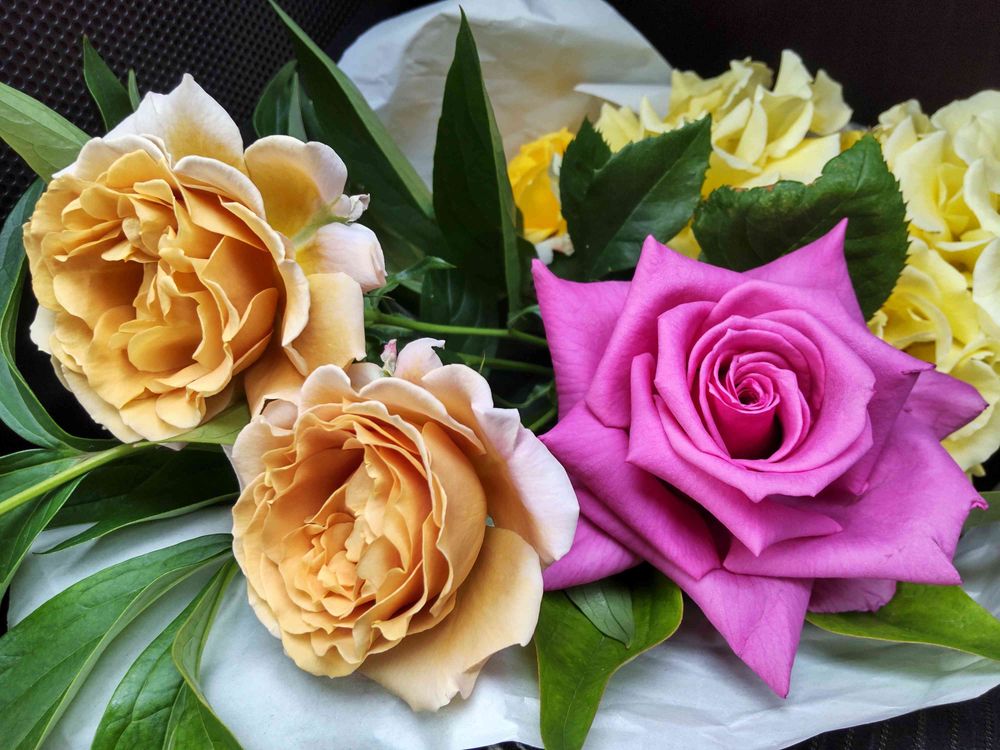 …なんだか暑い日があって 花もあっと言う間に開いてしまう その前に✂️🌹🥀カットして 💝貰ってくれそうな🤭所へ💐 昨日、里への配達🚘 助手席に💐置いた花束姿が😃💫ステキかも💡😄と 信号待ちの時に急いで撮ったものです😅