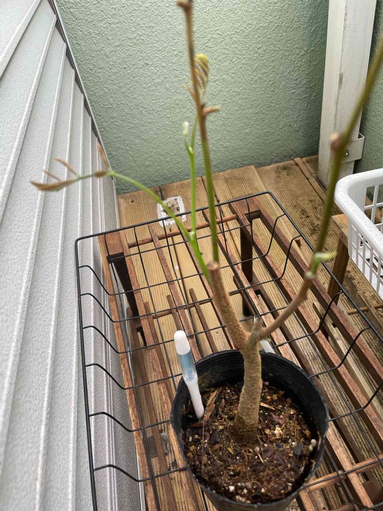 まだ肌寒い春にベランダ管理で失敗して全て落葉したエバーフレッシュ