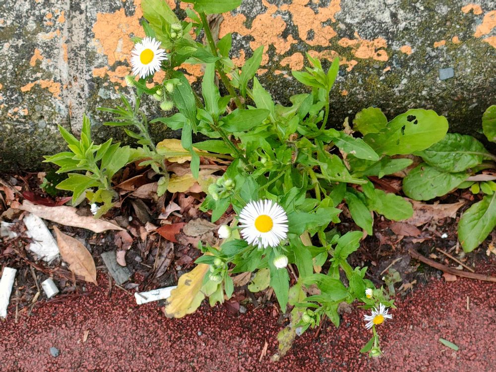 縁石の吹き溜まりで咲いていたヒメジョオン。