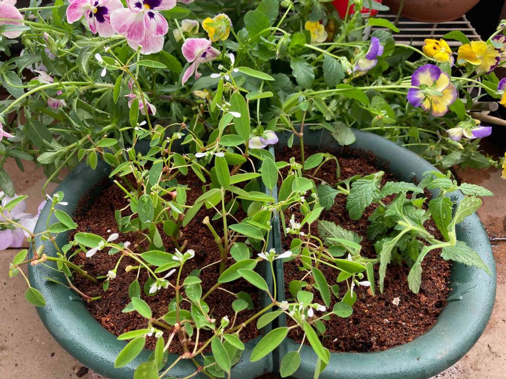 冬〜春にこの鉢に植えてたパンジーは鉢替えして種待ち。