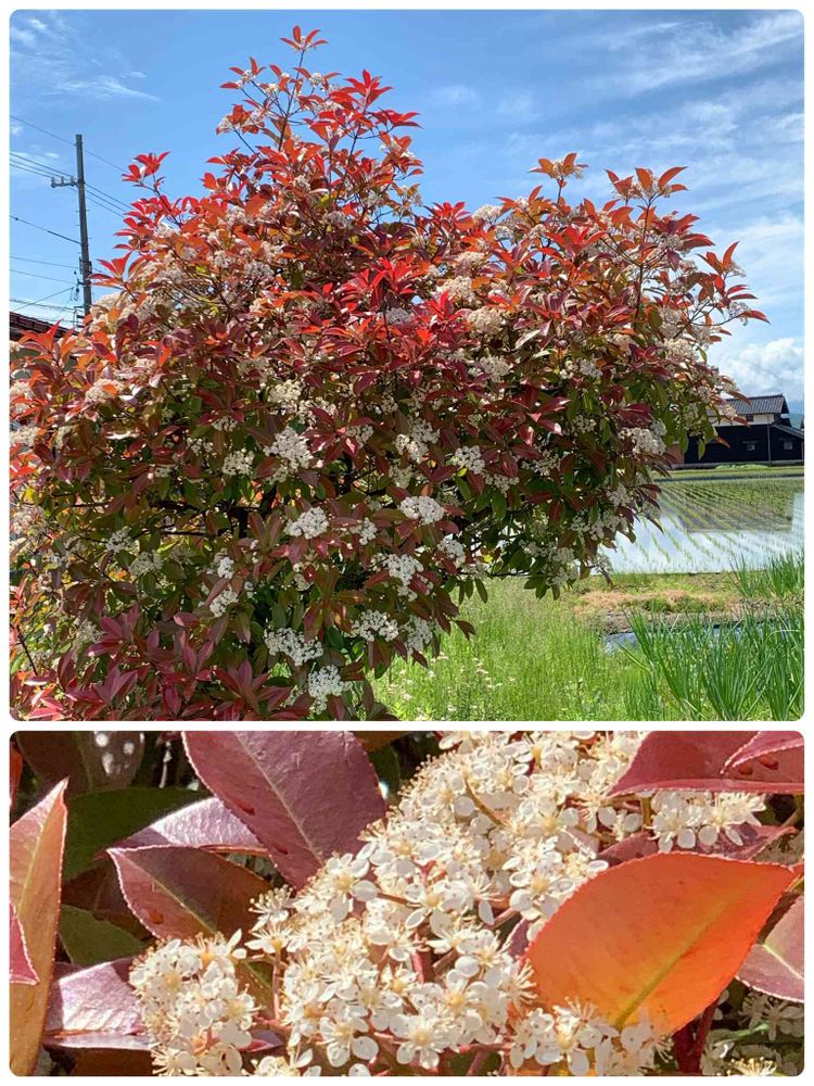 あちこちで赤い新芽🌱?の目立つ気にオフホワイトの花が咲いているのでずーっと気になっていたが、やっと撮影できました📸