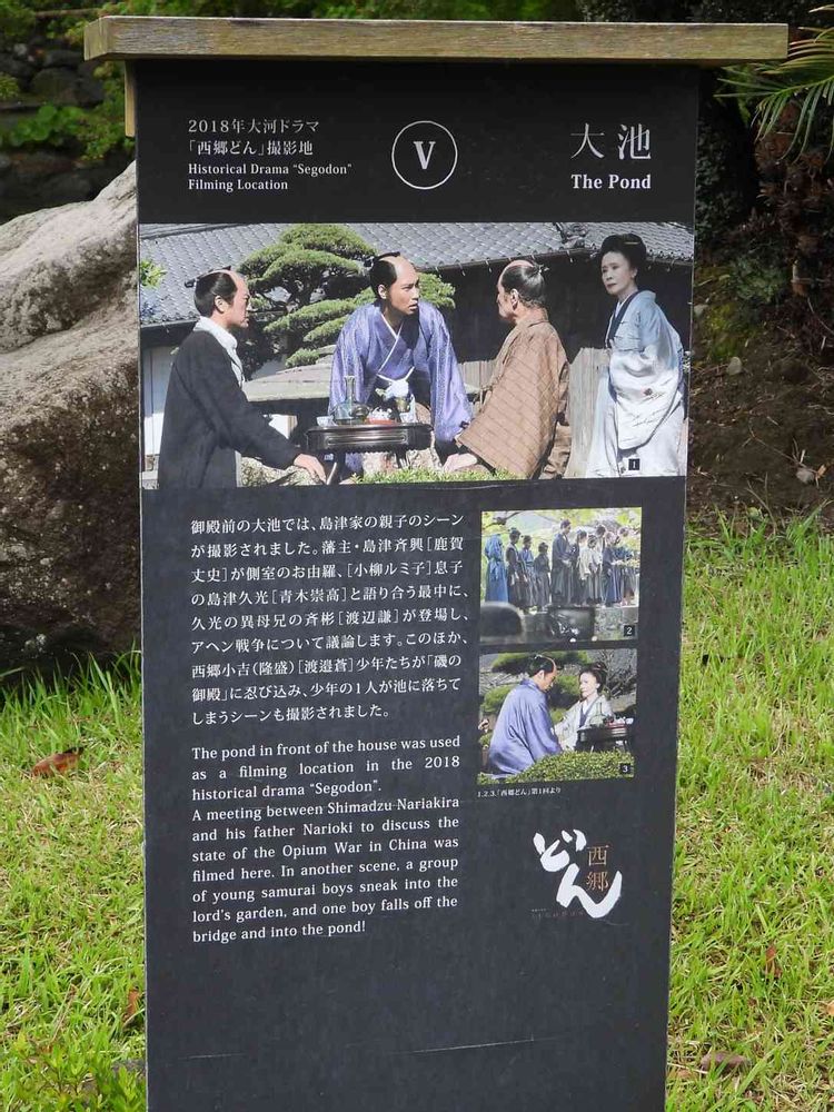 御殿前の大池では、 島津家の親子のシーン が撮影されました。 藩主島津斉興[鹿賀 丈史] が側室のお由羅、[小柳ルミ子] 息子 の島津久光 [青木崇高] と語り合う最中に、 久光の異母兄の斉彬 [渡辺謙] が登場し、 アヘン戦争について議論します。 このほか、 西郷小吉 (隆盛) [渡邉蒼] 少年たちが「磯の御殿」に忍び込み、 少年の1人が池に落ちて しまうシーンも撮影されました。