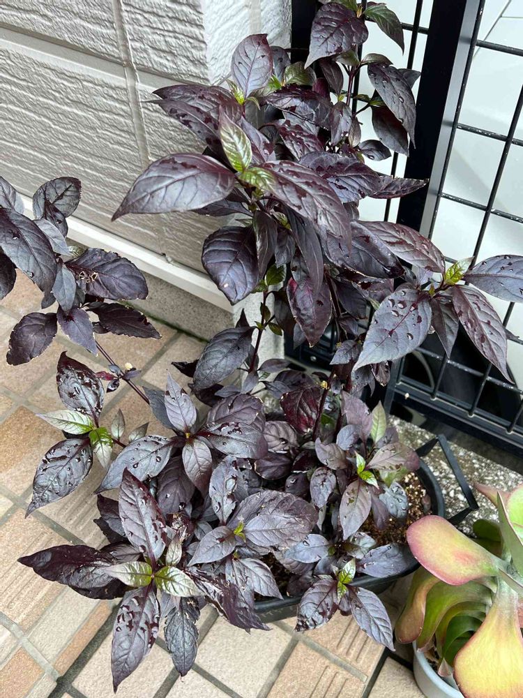 昨年11月末に、宮崎で見つけた苗が、¥80と安価で、赤い葉が美しかったのですが、冬越ししてるうちに、こんな色になりました😓