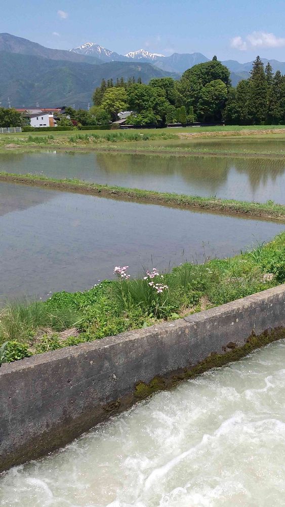 田植えの為水の供給をしてひと段落の用水路(せぎ)、田植えを終えた水田、緑の屋敷森、遠くに残雪が少なくなった常念岳と横通岳。