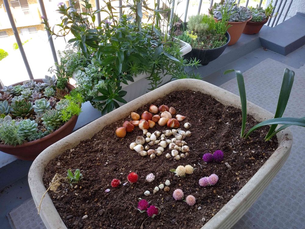チューリップとムスカリを掘り上げて、冬越しできた黄花千日紅と謎の球根(去年球根ごと抜いたはず。面白い😆)はそのままstayです。