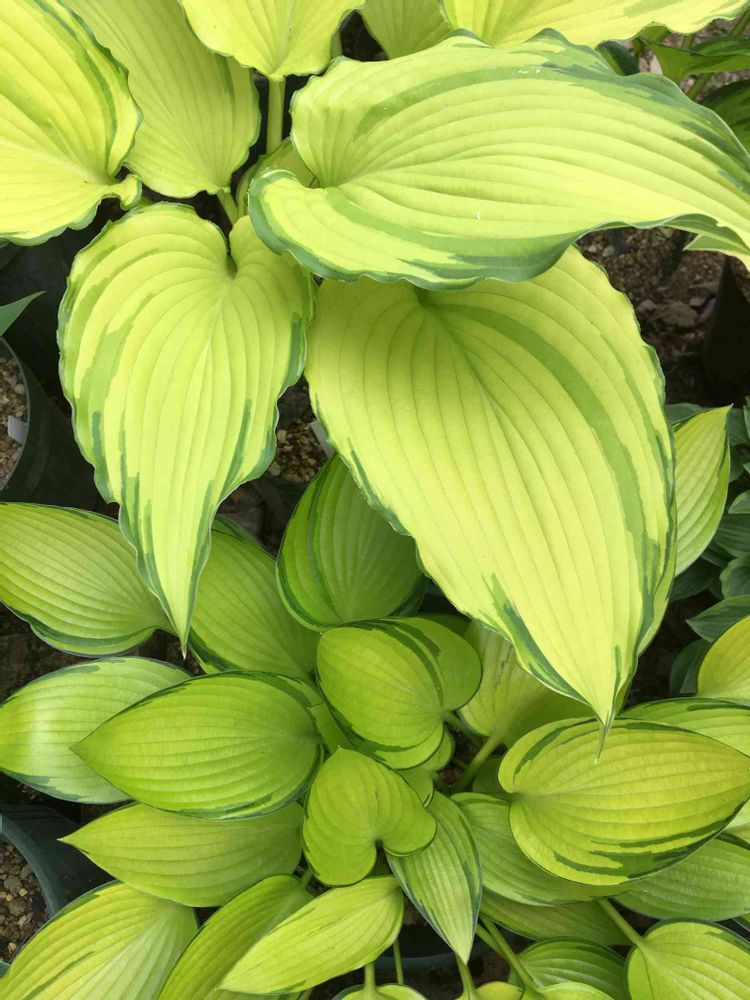 黄金の「ホスタのある風景」。pic上からファーストダンスとジューンフィーバーのコラボレーションです。いずれも黄金葉に緑色の絵の具を流したようなスリムな覆輪。それでも、葉の大きさ、形状、厚み、光沢など、など、フォルムやテクスチャに大きな違いがあります。葉だけでも、こうした幅広い変化があるのですから、ホスタの世界は奥深い。うーん、沼から這い上がれません。